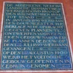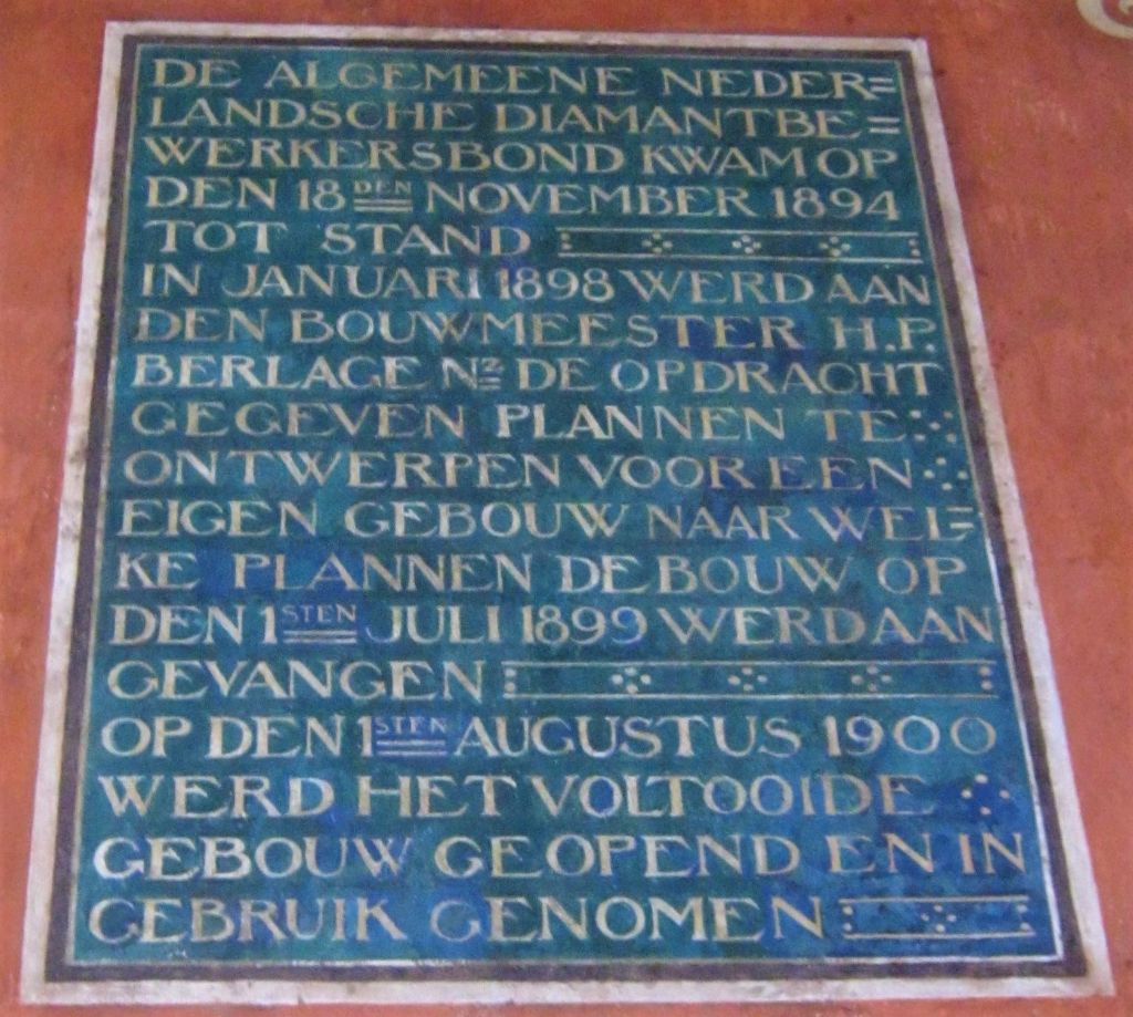 Van een echte eerste steen en een ‘steenlegger’ kunnen we hier niet spreken. Wel geeft het fraaie geschilderde tekstpaneel op een wand van de Bondsraadzaal aan wanneer de bouw van het pand is aangevangen: op 1 juli 1899. In onze collectie bevinden zich momenteel zeven eerste stenen in buitengevel of binnenwand van een pand dat gerelateerd was aan de diamantindustrie: Henri Polaklaan 9, Nieuwe Achtergracht 17, Nieuwe Uilenburgerstraat 173-175 (1878) en (1887), Valkenburgerstraat 72, Verversstraat 16-18, Verversstraat 26-28-30, Verversstraat 57, en Weesperplein 4a.