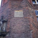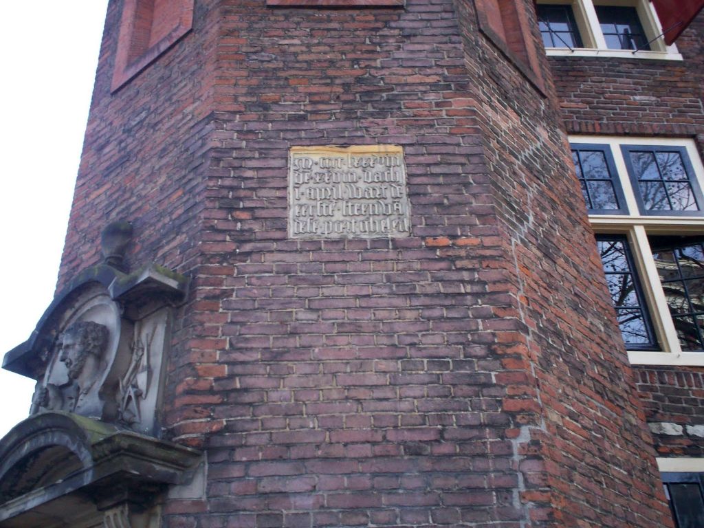 De gedenksteen is ingemetseld in het torentje, aan de kant van de Zeedijk en de Geldersekade. Deze steen van 28 april 1488 is de oudste ‘eerste steen’ van Amsterdam.